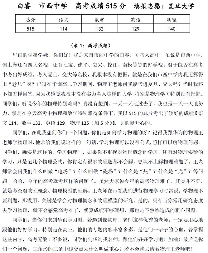 白睿市西中學(xué)高考成績(jī)515分填報(bào)志愿:復(fù)旦大學(xué)